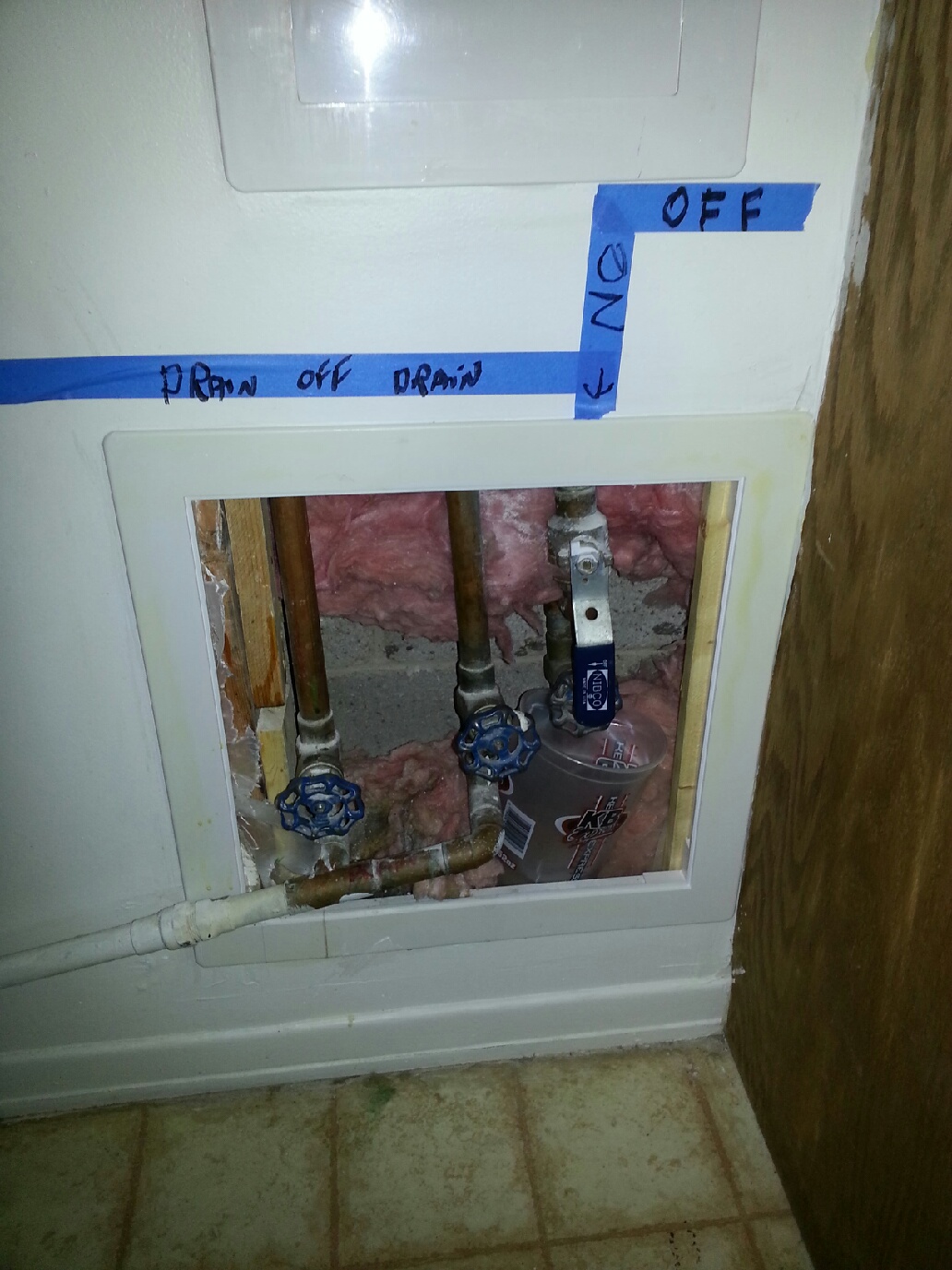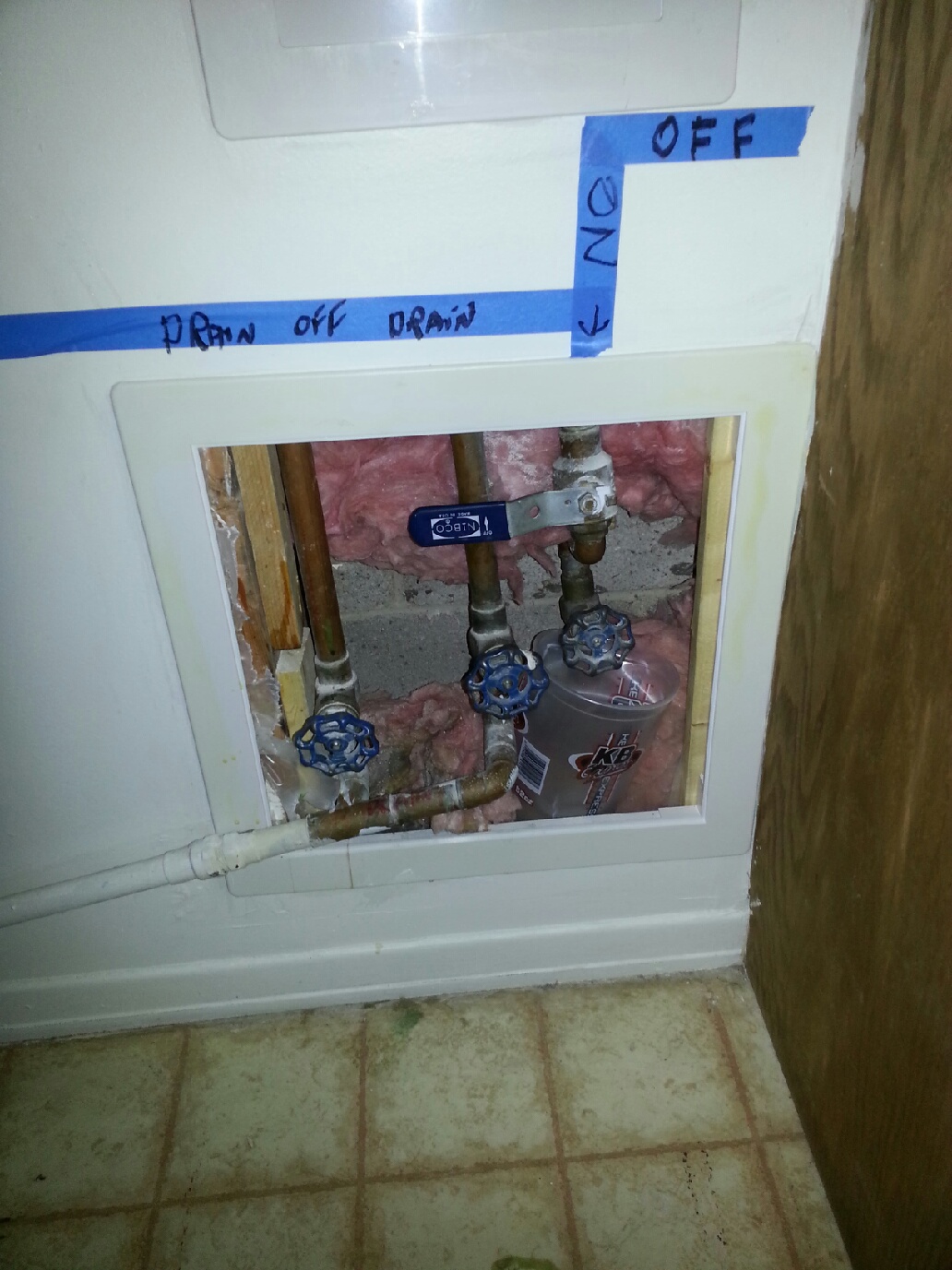 In the basement, to the right in the laundry room (tertiary bedroom with bunk beds), on the wall to the left of the countertop (and near the bunk bed) is a set of pipes set down low in the wall.